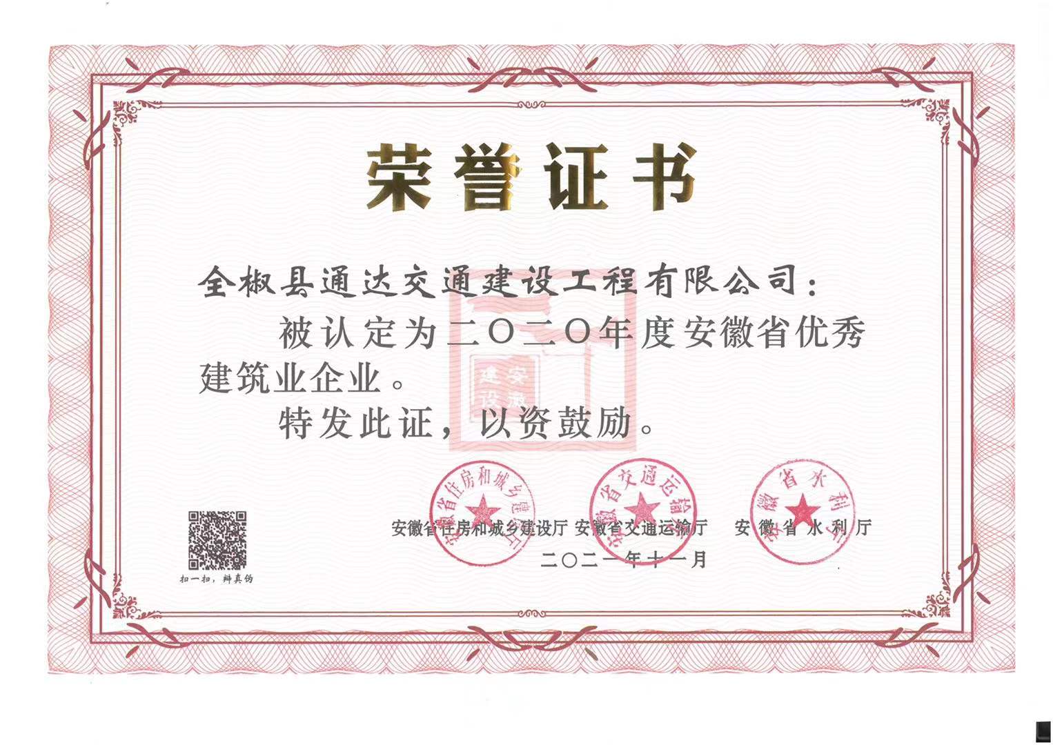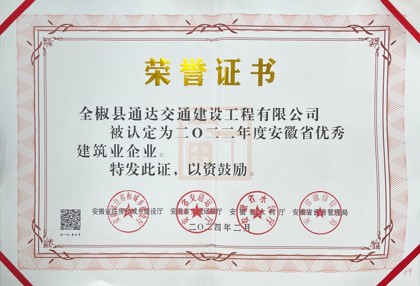 • 全椒縣通達榮獲2022年度安徽省優秀建筑業企業榮譽證書