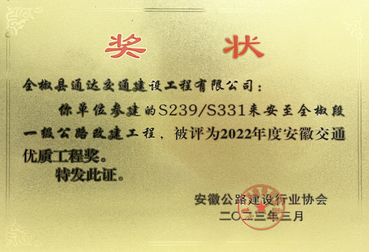 • S239/S331來安至全椒段一級公路改建工程,被評為2022年度安徽交通優質工程獎