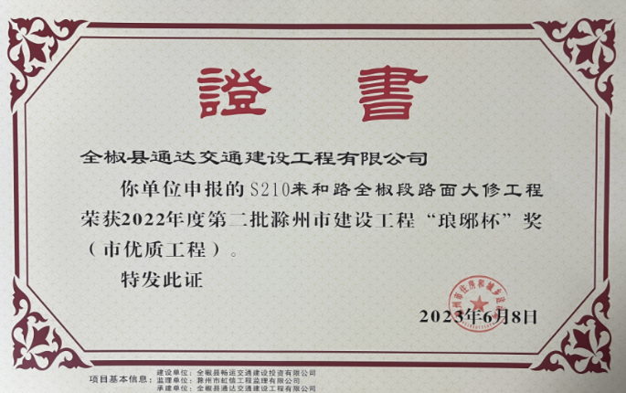 • S210來和路全椒段路面大修工程榮獲2022年度第二批滁州市建設工程“瑯琊杯”獎