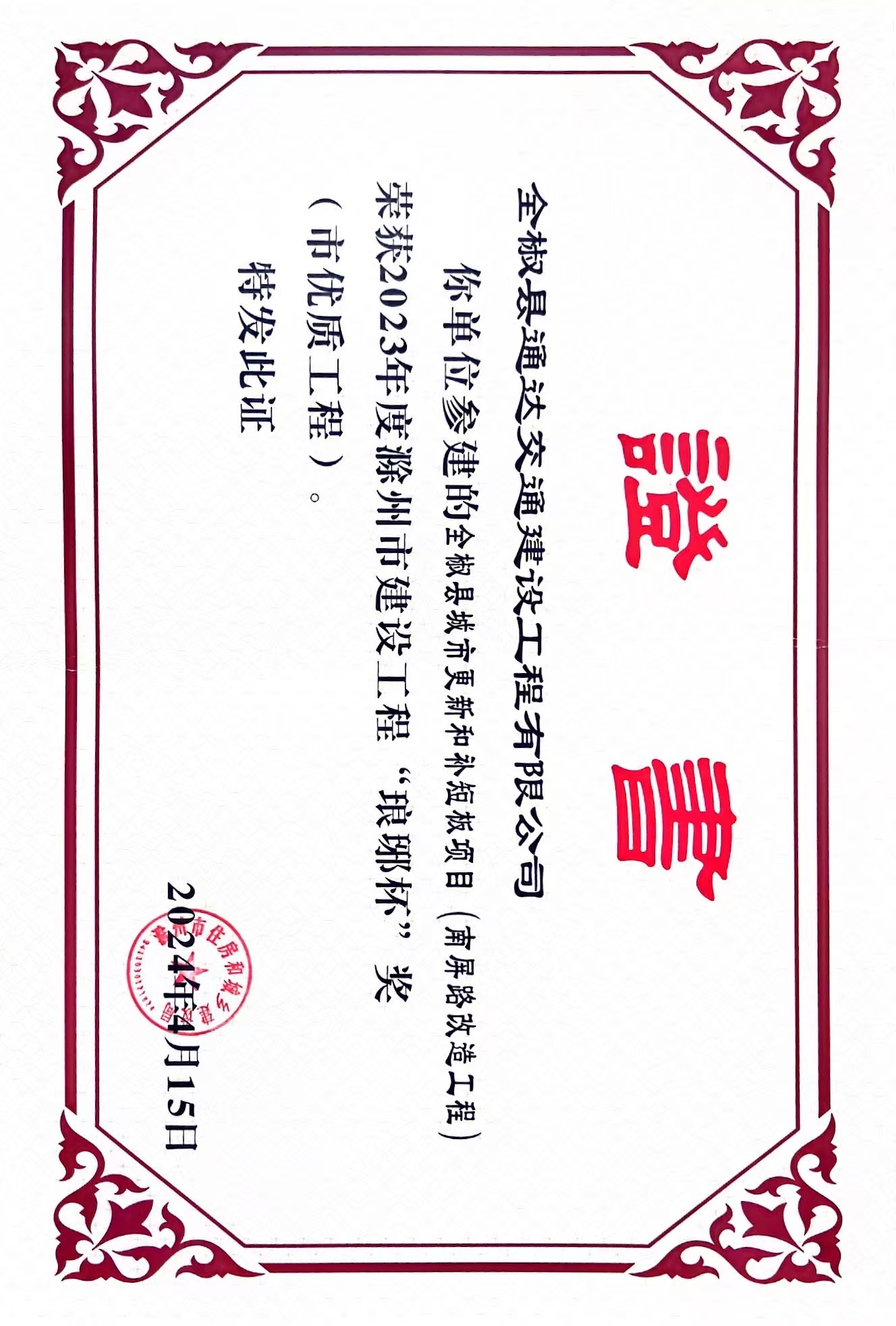 • 南屏路改造工程榮獲2023年度滁州市建設工程“瑯琊杯”獎